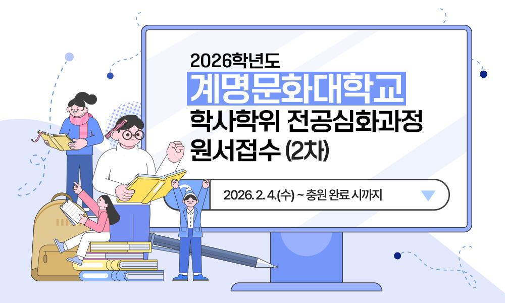 <박람회 정보> ◎ 박람회 명 : 2026학년도 대구·경북 전문대학 수시모집 입학정보 박람회 ◎ 참가대학 : 계명문화대학교 포함 대구·경북지역 19개 전문대학교 - 참가 대학명 가나다 순 : 가톨릭상지대학교, 경북과학대학교, 경북보건대학교, 경북전문대학교, 계명문화대학교, 구미대학교, 대경대학교, 대구공업대학교, 대구과학대학교, 대구보건대학교, 문경대학교, 선린대학교, 수성대학교, 안동과학대학교, 영남외국어대학교, 영남이공대학교, 영진전문대학교, 포항대학교, 호산대학교 ◎ 박람회 내용 1) 전공 및 진로 상담 2) 대학 소개 3) 수시모집 원서접수 ※ 특전 : 해당 박람회에서 ‘계명문화대학교’ 수시모집 1차 원서접수자 전형료 및 원서접수료 감면 ◎ 장소 : 대구상원고등학교 체육관(상원관) (대구 달서구 월배로 241) / 대구지하철 1호선 상인역 7번출구 도보 5분 거리 ◎ 일정 1) 2025.09.12.(금)(1일차) - 14:00 ~ 20:00 2) 2025.09.13.(토)(2일차) - 10:00 ~ 17:00 ◎ 박람회 안내 및 참가자 사전 등록 페이지 : https://2026ipsigo.kr ※ 해당 페이지에서 ‘대구·경북권 박람회 사전신청 바로가기’ 메뉴에서 신청 ◎ 주최·주관 : 한국전문대학교육협의회, 한국전문대학교무입학처장협의회, 한국전문대학입학관리자협의회 ◎ 후원 : 교육부 ◎ 문의 : 계명문화대학교 입학팀(053-589-7800)